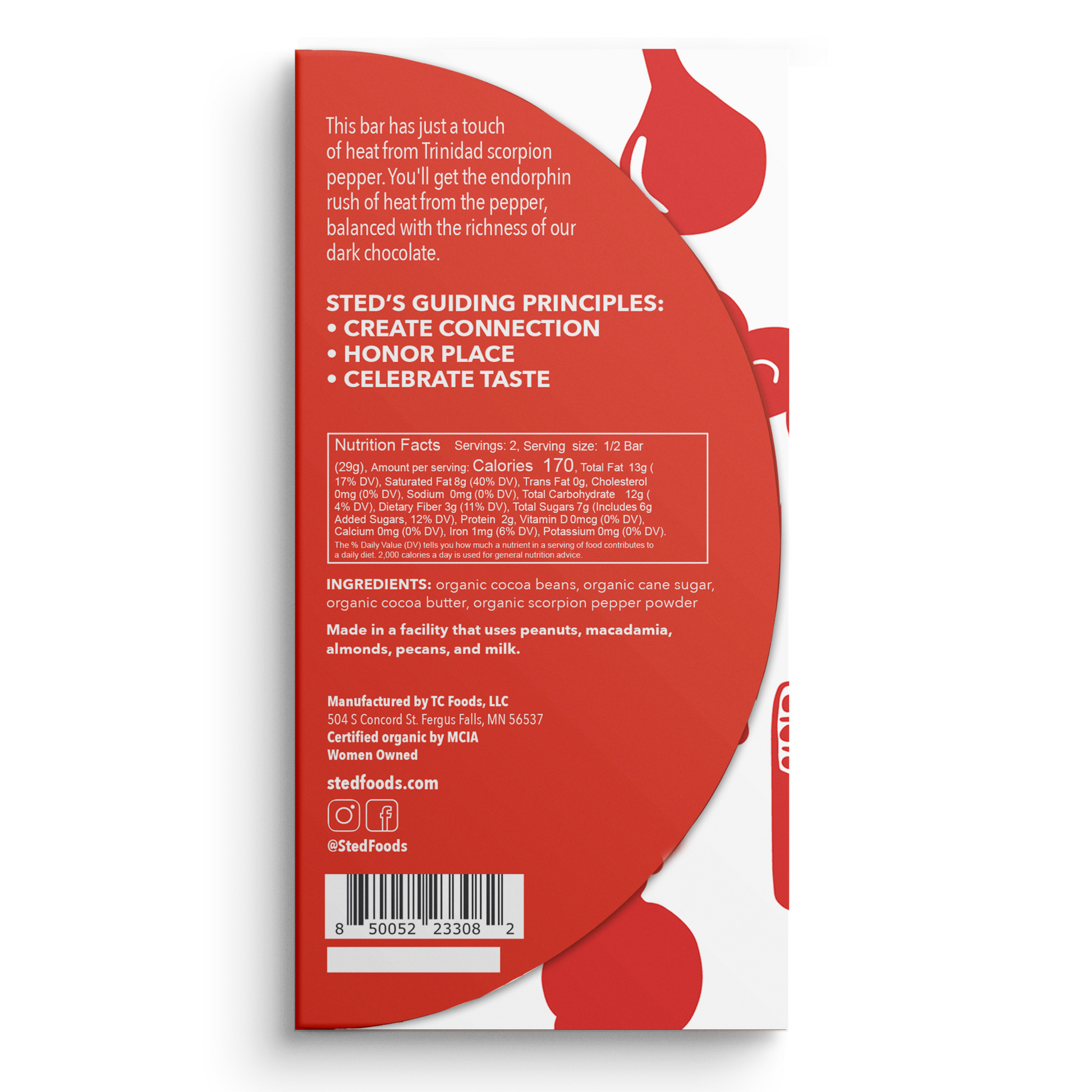 This bar has just a touch of heat from Trinidad scorpion pepper. You'll get the endorphin rush of heat from the pepper, balanced with the richness of our dark chocolate.